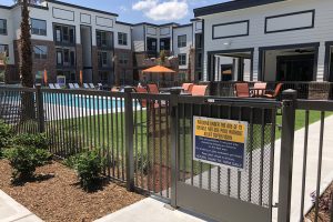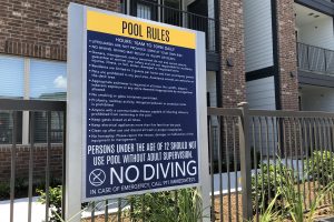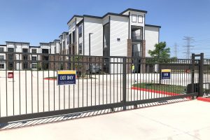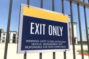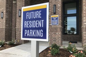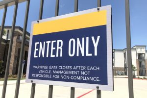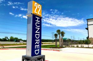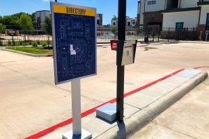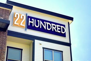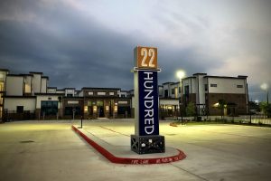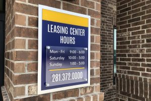 The industrial-inspired 22 Hundred combines thought and function with bold intension. This campaign highlights the community’s urban influences while informing prospects and residents. RC worked with architects to design the large 18’ wide identity into the building, beckoning to Sam Houston Tollway travelers. The striking vertical monument sits upon robust scaffolding and greets prospects and residents as they enter. Signs are consistent, simple and effective throughout the property. Posts are sleek, brushed aluminum and faces continue the gold and blue color combination.