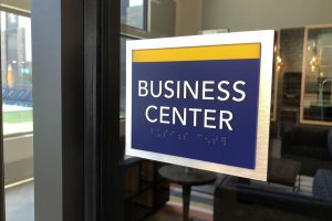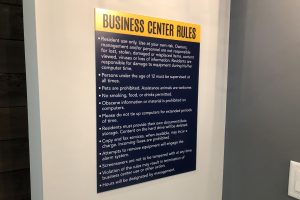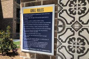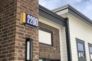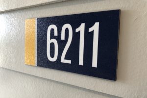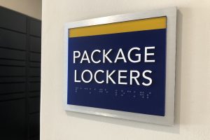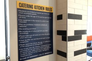 Main signage features brushed aluminum backers, acrylic fronts with tactile letters. Secondary signs utilize high-pressure laminate. The overall design, materials and placement add to the unique atmosphere of the community and celebrate its distinctive approach to living.