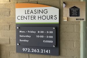 Many repositioned communities are older properties in need of a facelift. Impactful identity combined with branded signs are the one element that flows throughout the community. By utilizing Design Studio or a custom campaign, RC uses exclusive materials and methods to ensure affordable options. Long-lasting powder-coated aluminum posts, exterior high-pressure laminates and durable urethane products are combined with dynamic design. The results are amazing and save the budget when signs are essential.