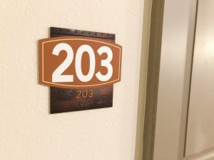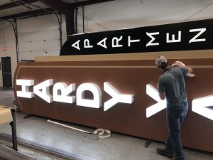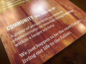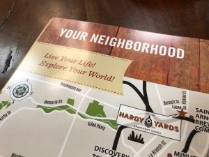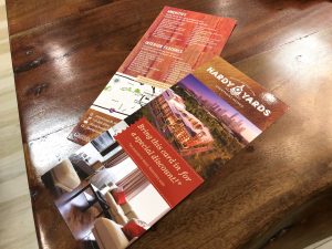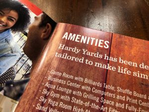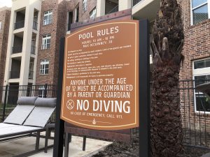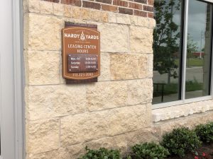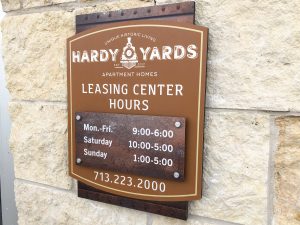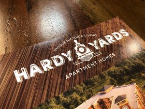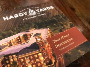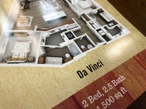 A large blade identity complete with retro neon letters becomes the focal point of the iconic clock tower, while community signage follows with similar shapes and colors. Cement graphics alert residents to key elevator and stairs in pedestrian areas. These images tell the story of long past and capture the atmosphere of a by-gone time. Print collateral using the Design Studio affordable Brand on Demand™ continues this powerful theme throughout the corporate image, brochure and marketing pieces.