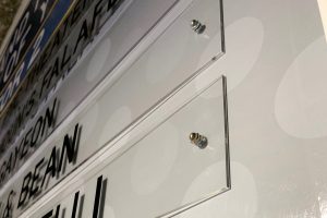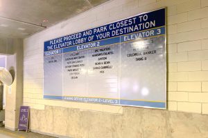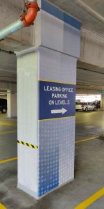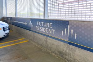 A new overall brand is established with stylistic and memorable graphics. Colors are utilized for both garage and interior building, continuing the brand. With expansive garage cement wraps, bold interior wall graphics, shopping directories in key areas and elegantly updated, double-layered identity signage, each group is easily directed without confusion. Strategically placed graphics allow prospective residents a clear directive with NO mixed messages.